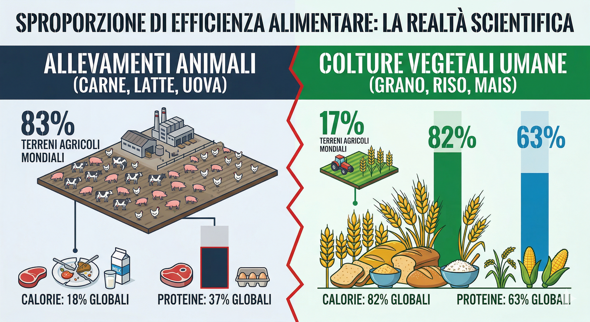 Siamo di fronte a un paradosso termodinamico: usiamo la stragrande maggioranza delle risorse terrestri per nutrire animali che poi mangiamo, disperdendo nel processo l'82% dell'energia calorica potenziale. È come investire 100 euro per riceverne 18 in cambio. Nessuna azienda sopravviverebbe a un simile bilancio; perché permettiamo che lo faccia il nostro pianeta?